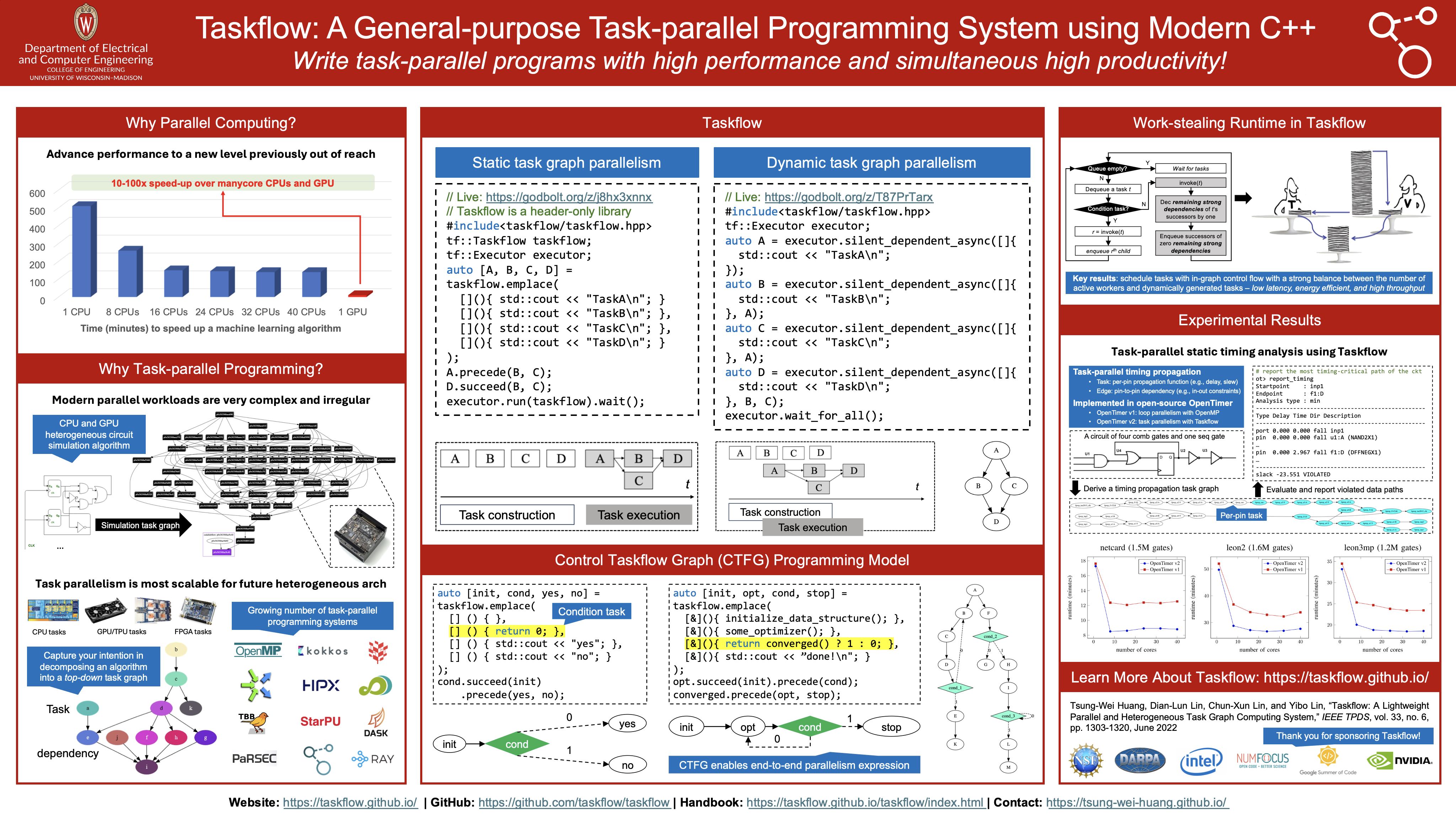 See a quick poster presentation below and visit the [documentation][documentation] to learn more about Taskflow. Technical details can be referred to our [IEEE TPDS paper][TPDS22].